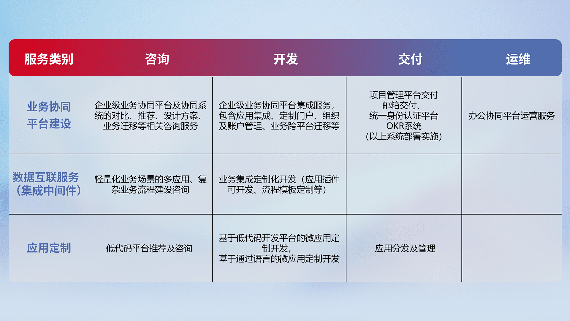 针对钉钉、、、企微、、、IDaas等平台级产品提供产品的规划、、方案、、、交付、、、、定制化开发等服务,,,实现如统一协同办公、、、智能客户服务、、、混合会议管理、、智能数据查询、、等业务场景,,,实现数字化转型。。。。