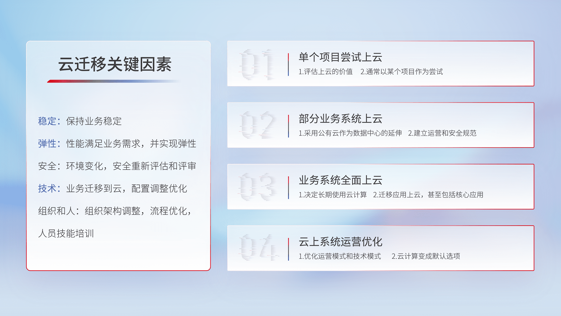 结合实际业务,,,,从规划设计、、、云平台选型、、、云原生改造、、数据迁移、、、、集成交付,,迁移全过程为客户识别最佳上云路径,,,做好风险识别管理,,设计网络架构、、身份权限、、、、安全审计合规、、、、操作审计、、、、日志审计、、监控告警策略、、、、多站点容灾设计等,,,,对云上基础设施进行整体规划,,,,提升IT治理水平,,,,以满足弹性、、、高可用、、、高性能的需求。。。。