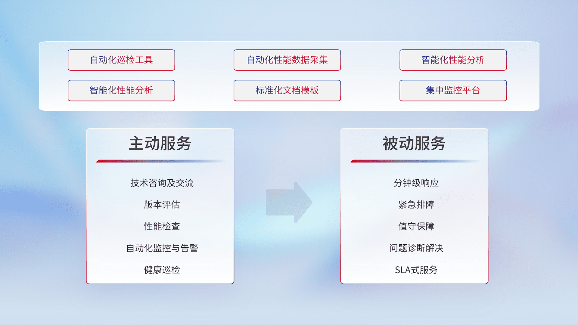 智能化工具和标准化文档,,,保障服务质量,,,,提供主动服务(包含技术咨询、、、版本评估、、、性能检查、、自动化监控与告警、、、、健康巡检)和被动服务包含(分钟级响应、、、、紧急排障、、、、值守保障、、、、问题诊断解决、、、SLA服务)。。。。